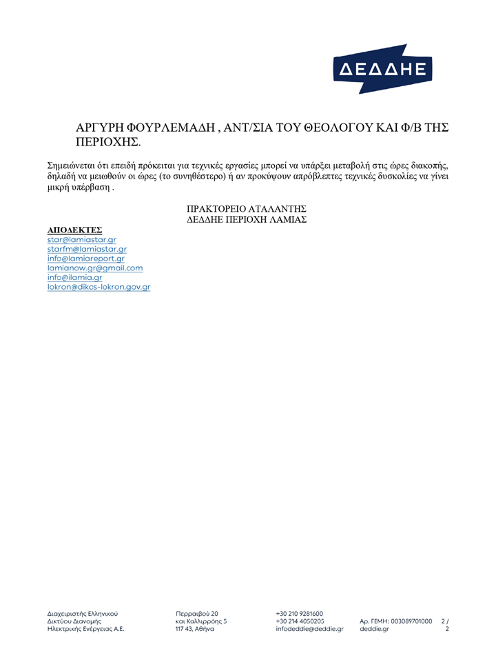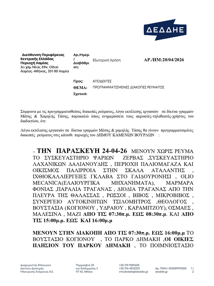 Υποβλήθηκε Δε, 20/04/2026 - 12:05 Προγραμματισμένες διακοπές ρεύματος στο Δήμο Λοκρών