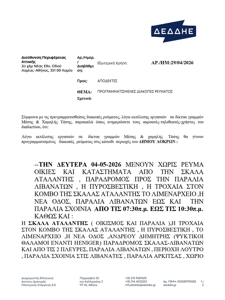 Προγραμματισμένες διακοπές ρεύματος στο Δήμο Λοκρών