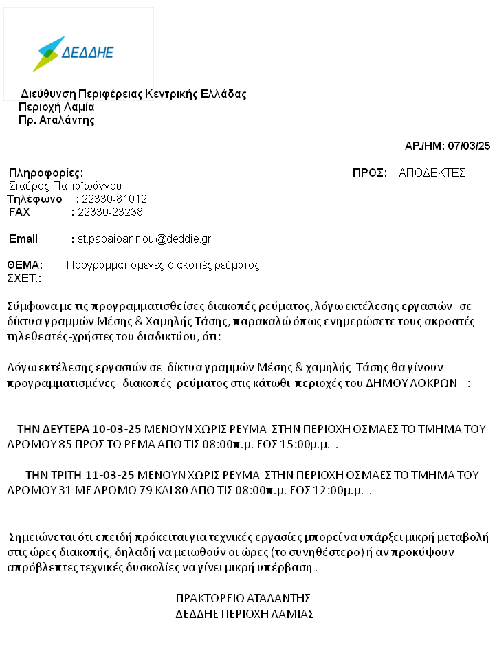 Προγραμματισμένες διακοπές ρεύματος στο Δήμο Λοκρών