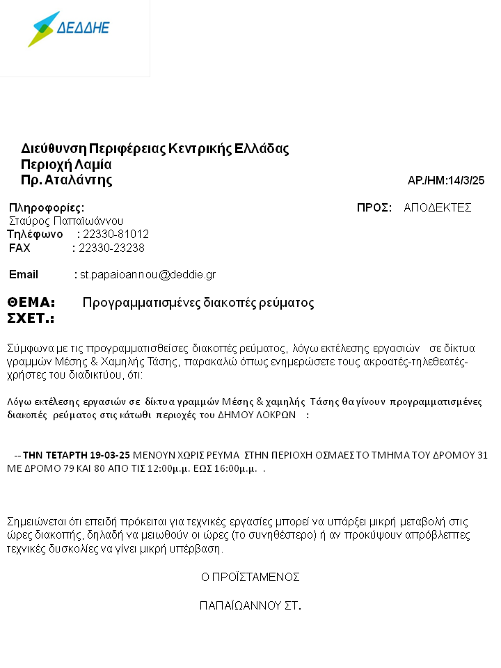 Προγραμματισμένες διακοπές ρεύματος στο Δήμο Λοκρών