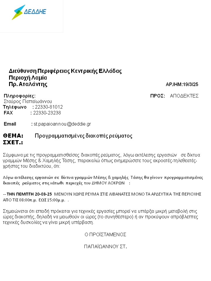 Προγραμματισμένες διακοπές ρεύματος στο Δήμο Λοκρών