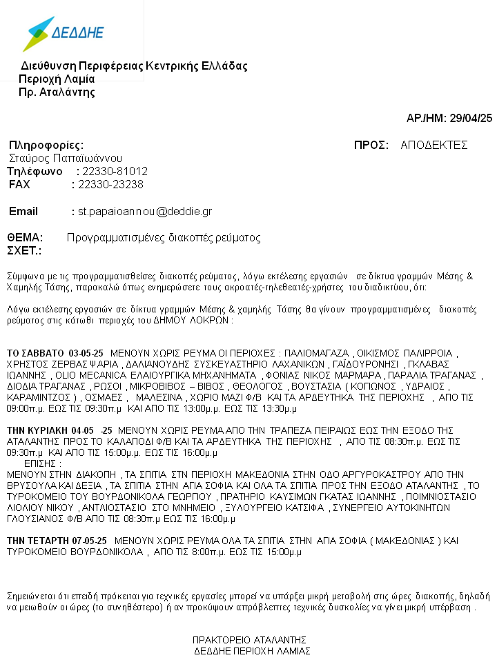 Προγραμματισμένες διακοπές ρεύματος στο Δήμο Λοκρών