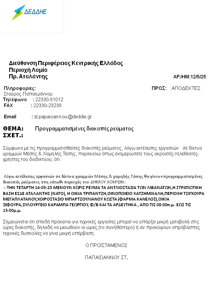 Προγραμματισμένες διακοπές ρεύματος στο Δήμο Λοκρών