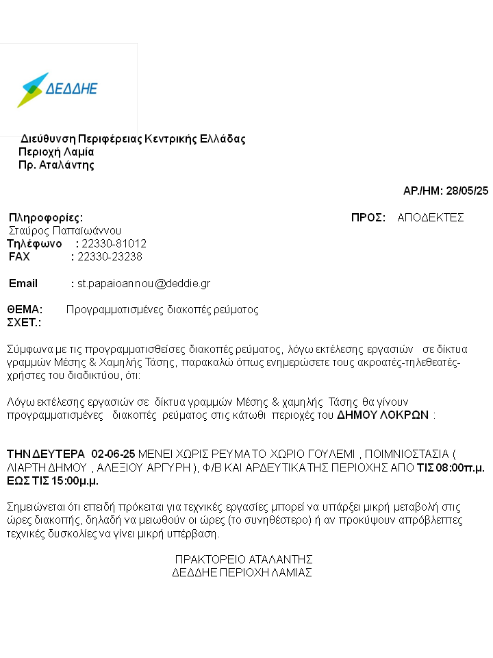 Προγραμματισμένες διακοπές ρεύματος στο Δήμο Λοκρών