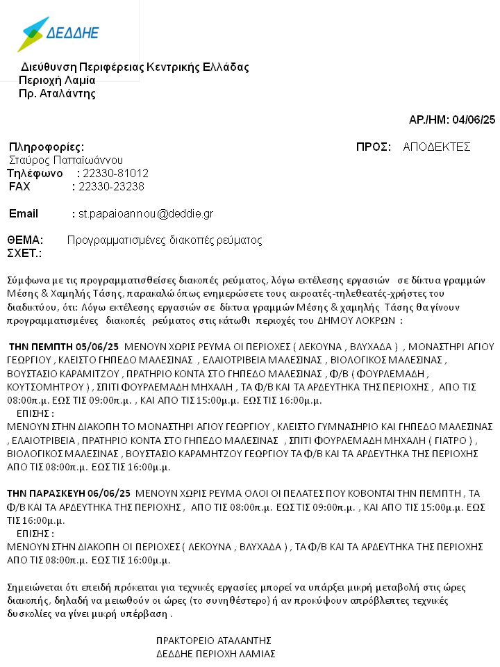 Προγραμματισμένες διακοπές ρεύματος στο Δήμο Λοκρών