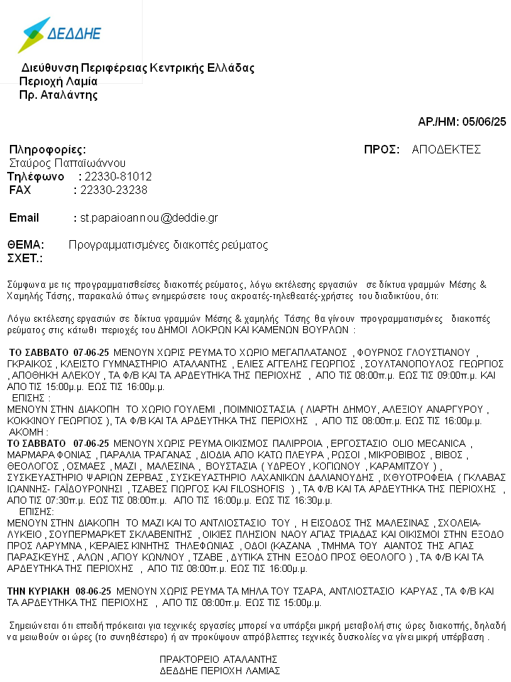 Προγραμματισμένες διακοπές ρεύματος στο Δήμο Λοκρών