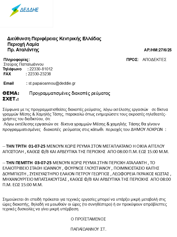 Προγραμματισμένες διακοπές ρεύματος στο Δήμο Λοκρών