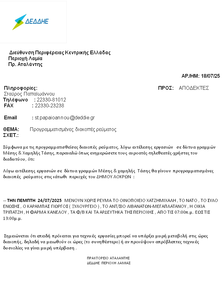 Προγραμματισμένες διακοπές ρεύματος στο Δήμο Λοκρών