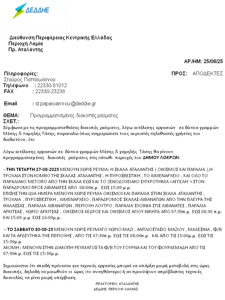 Προγραμματισμένες διακοπές ρεύματος στο Δήμο Λοκρών