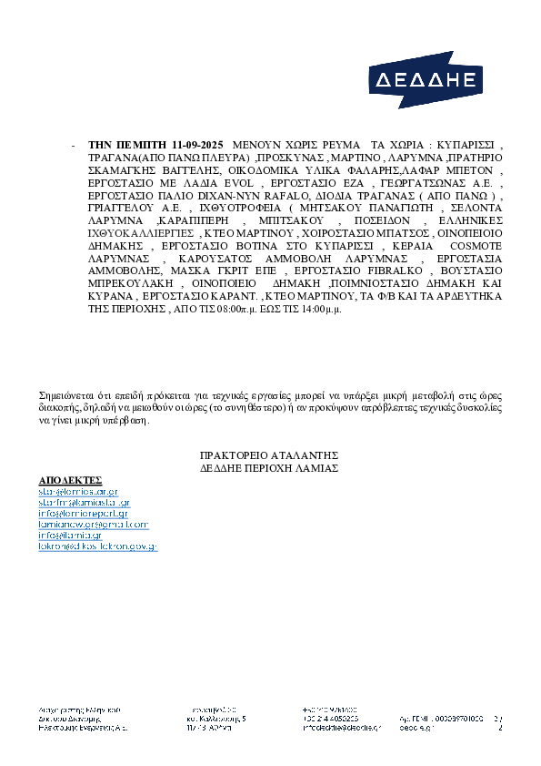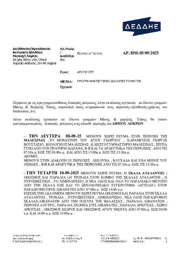 Υποβλήθηκε Πα, 05/09/2025 - 03:01 Προγραμματισμένες διακοπές ρεύματος στο Δήμο Λοκρών