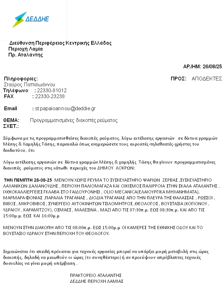 Προγραμματισμένες διακοπές στο Δήμο Λοκρών