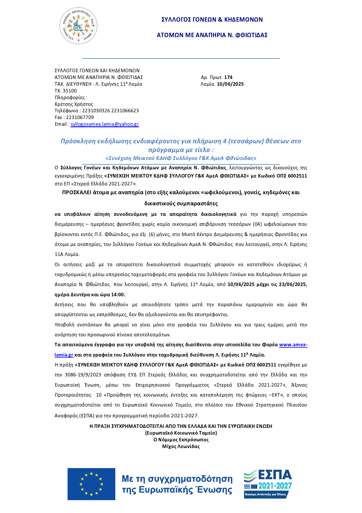 Υποβλήθηκε Τε, 11/06/2025 - 04:02 Πρόσκληση εκδήλωσης ενδιαφέροντος για πλήρωση 4 (τεσσάρων) θέσεων στο πρόγραμμα με τίτλο : «Συνέχιση Μεικτού ΚΔΗΦ Συλλόγου Γ&Κ ΑμεΑ Φθιώτιδας»