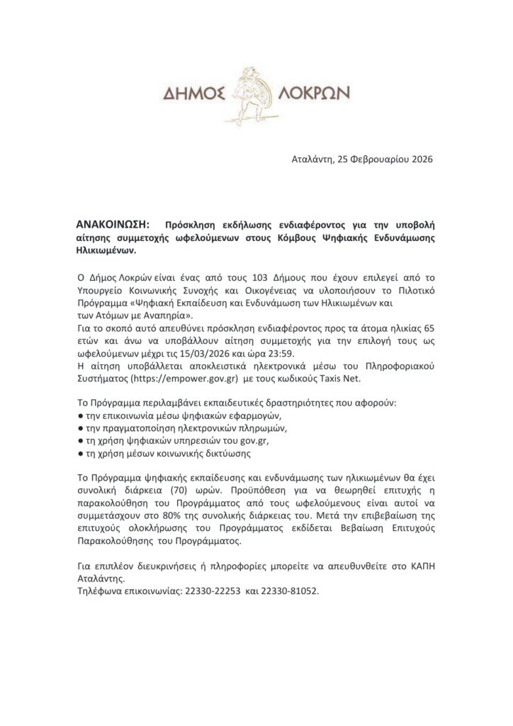 Δημιουργία Μητρώου Νέων για τη συγκρότηση Δημοτικού Συμβουλίου Νέων στο Δήμο Λοκρών